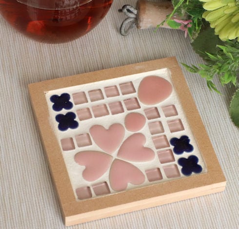キラキラ光るガラスタイルの中に、かわいいハートやクローバーなどのタイルを配置したおしゃれなコースターです。